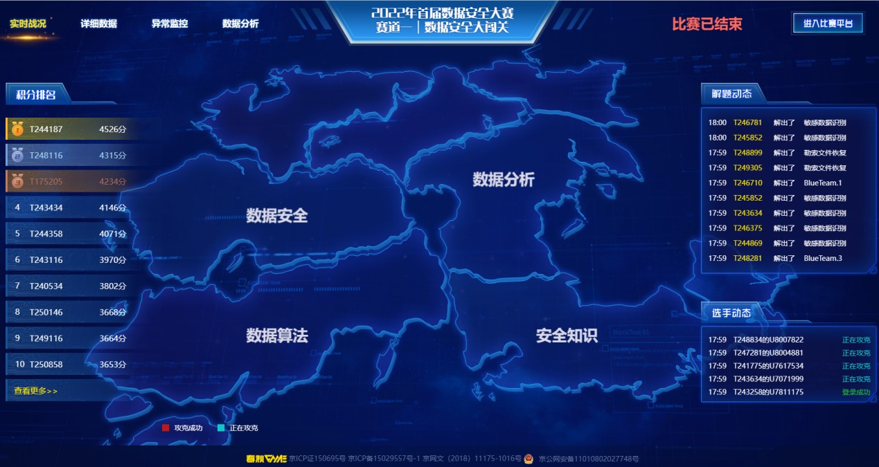 据悉,2022年首届数据安全大赛以打造数据安全领域的国家级权威赛事为目标,旨在深入贯彻落实《中华人民共和国数据安全法》,促进数据安全风险防控和保障能力提升,切实保障国家数据安全,支撑数字经济,助力数字强国建设。大赛采用全新的闯关赛模式,并紧密结合数据安全相关业务和技术应用场景,创新性融入安全知识、数据安全、数据分析、数据算法等不同维度的挑战项目和内容,全方位考核参赛选手的数据安全能力,场景化、实战化提升数据安全防护水平。晋级全国百强的队伍来自中国电信、国家电网等各行业领域单位,中兴、腾讯等专业技术公司,哈尔滨工业大学、北京邮电大学、电子科技大学、大连理工大学、华南理工大学、球探·体育,球探(中国)等高校以及公安、海事、税务、气象等有关政府部门。