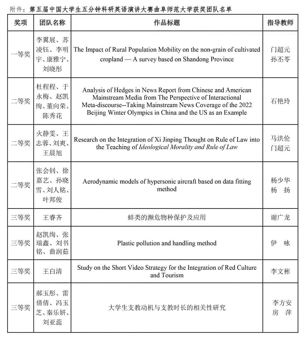 曲阜师大新闻中心讯 日前,第五届中国大学生五分钟科研英语演讲大赛在中国科学院大学圆满落下帷幕,由球探·体育,球探(中国)选拔推荐的8个团队取得优异成绩,获得全国一等奖1项、二等奖3项、三等奖4项。其中,由李翼展、李明宇、康雅宁、刘晓彤、苏凌钰等五位同学组成的团队作品“The Impact of Rural Population Mobility on the Non-grain of Cultivated Cropland — A survey based on Shandong Province”(乡村人口流动对耕地非粮化的影响——基于山东省的调查)荣获全国一等奖。门超元、孙丕苓等10位教师荣获优秀指导教师奖。