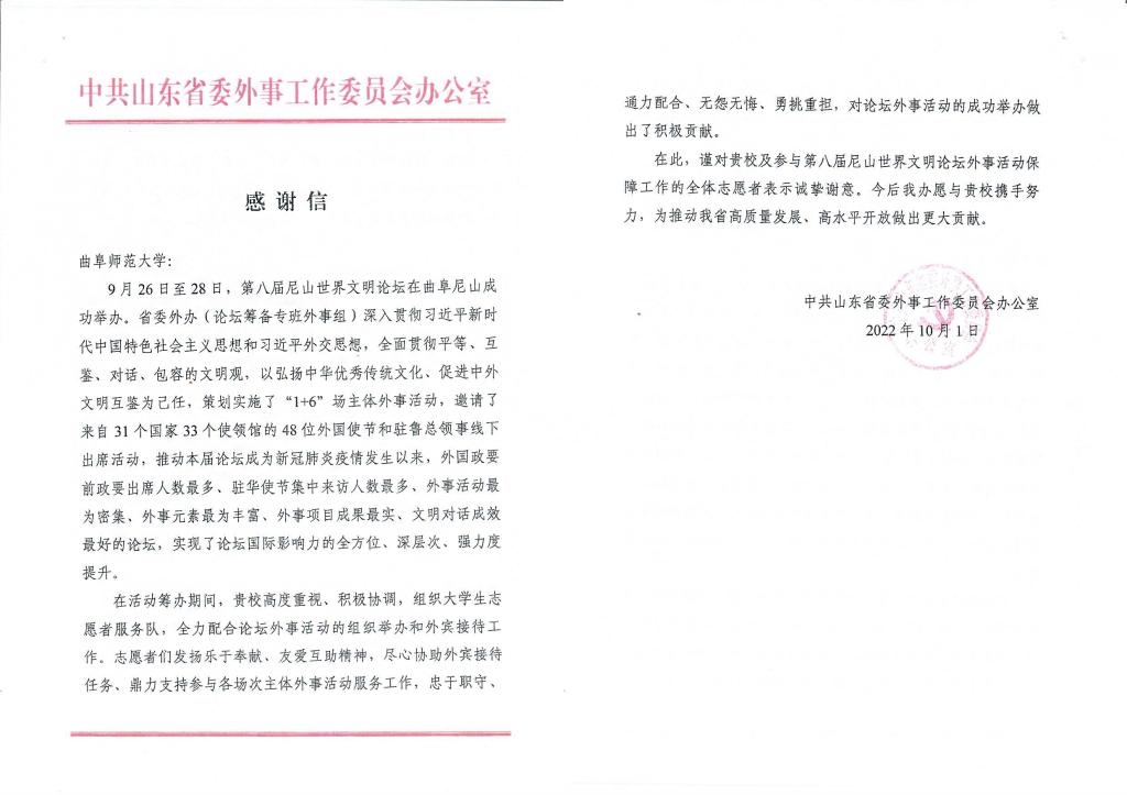曲阜师大新闻中心讯 日前,曲阜师大收到一封来自中共山东省委外事工作委员会办公室的感谢信,对我校认真组织大学生志愿者服务队参加第八届尼山世界文明论坛外事活动,对论坛成功举办提供有力保障表示诚挚感谢。
