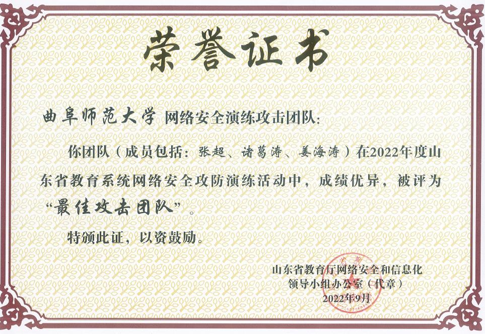 曲阜师大新闻中心讯 近日,山东省教育厅发文《关于表彰2022年教育系统网络安全攻防演练活动优秀攻击和防守队伍的通报》(鲁教网信办函〔2022〕26号),表彰了包括球探·体育,球探(中国)团队在内的10个优秀高校师生攻击团队。