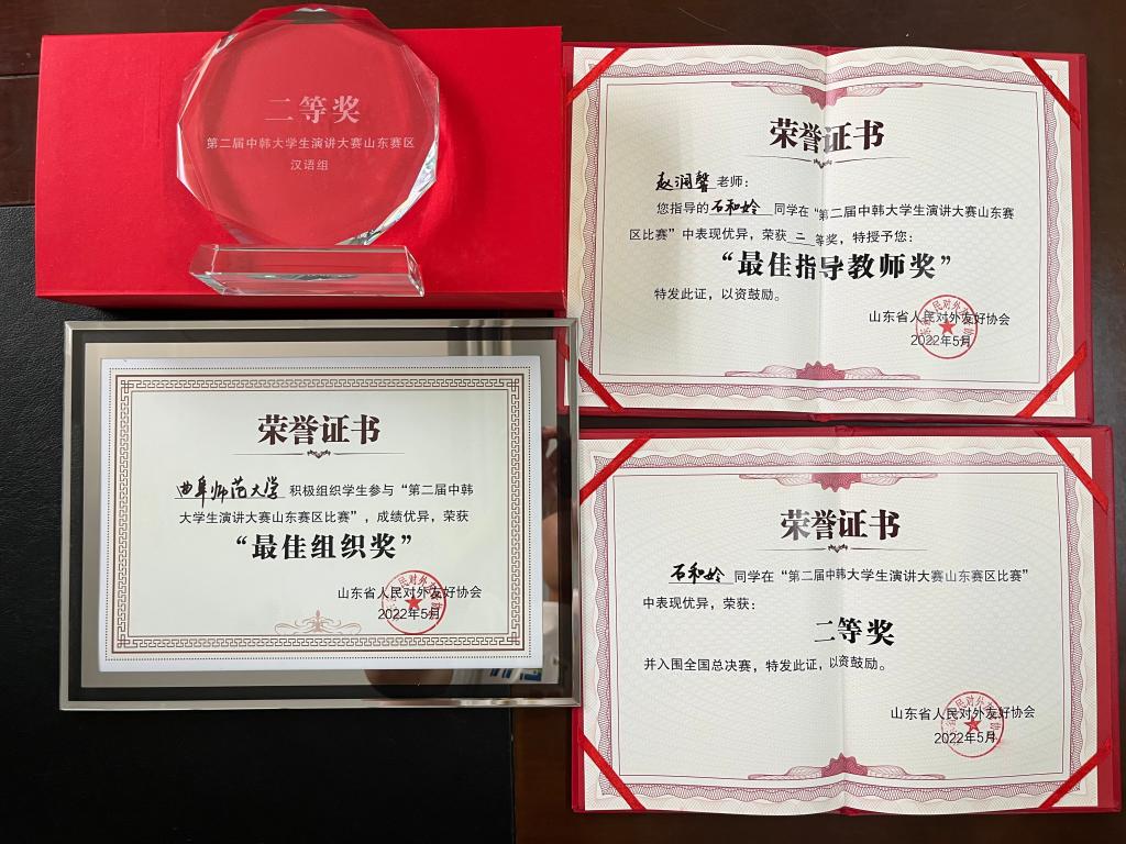曲阜师大新闻中心讯(通讯员:司甫) 5月25日,由山东省人民对外友好协会承办的第二届中韩大学生演讲大赛山东赛区颁奖仪式在线上举行。经过激烈角逐,我校国际教育学院韩国籍留学生石和姈脱颖而出、喜创佳绩,荣获汉语组二等奖,将代表山东赛区出征全国总决赛。赵润馨老师获“优秀指导教师奖”,我校获“最佳组织奖”(最高奖)。