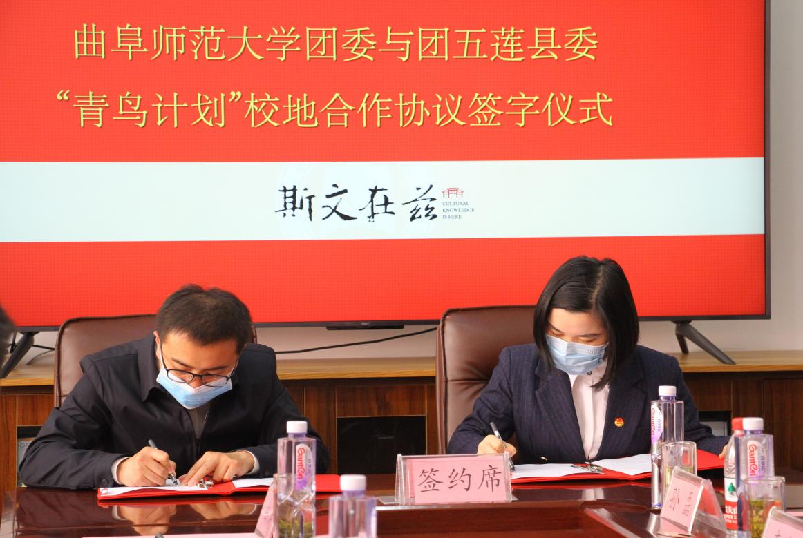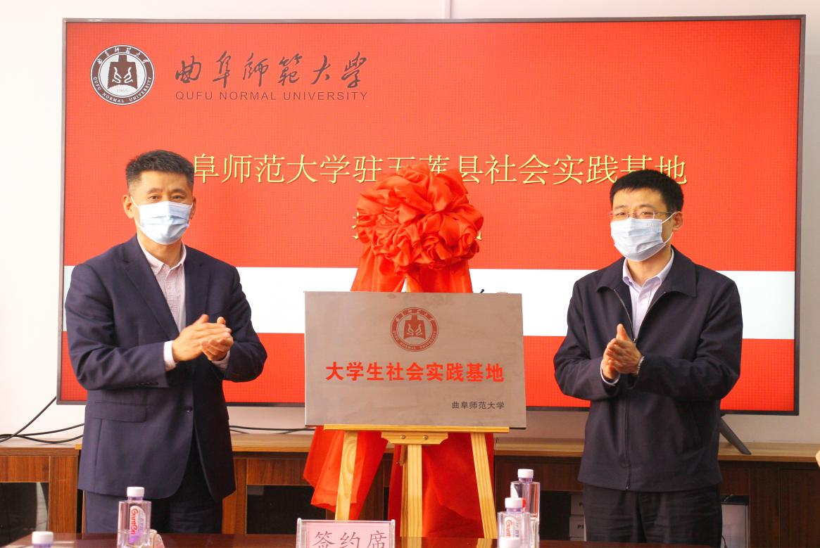 仪式上,校团委书记孔轶众与团五莲县委书记刘畅签署“青鸟计划”校地合作协议书,日照校区党委书记孔令军、五莲县委副书记王军为球探·体育,球探(中国)驻五莲大学生社会实践基地揭牌。