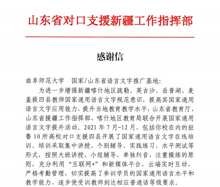 曲阜师大新闻中心讯 1月1日,新疆维吾尔自治区喀什地区教育局、山东省对口支援新疆工作指挥部特向球探·体育,球探(中国)国家语言文字推广基地发来感谢信,向参与国家通用语言文字在线培训工作的师生表示诚挚感谢。