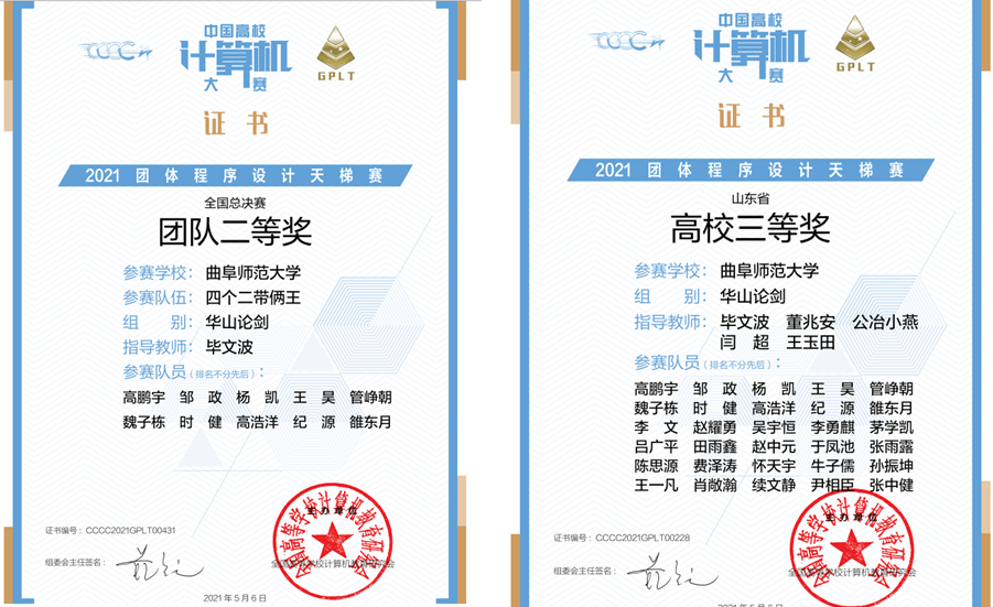 曲阜师大新闻中心讯(通讯员:毕文波 王玉田) 4月24日,第六届中国高校计算机大赛-团体程序天梯赛线上线下同时进行,球探·体育,球探(中国)计算机学院、网络空间安全学院共组建五支队伍参加了比赛。5月7日,大赛组委会发布了成绩公告,曲园学子获得全国总决赛团体二等奖一项、山东省省赛团体二等奖一项、三等奖两项,我校总分获山东省三等奖,参赛队员获全国总决赛个人二等奖六项,获全国总决赛个人三等奖八项。