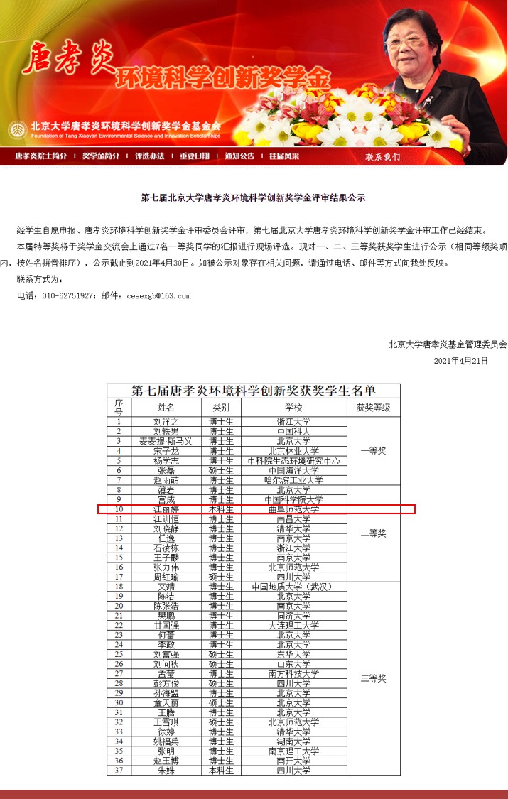 曲阜师大新闻中心讯(通讯员:杨珺斐) 4月21日,第七届北京大学唐孝炎环境科学创新奖学金评审结果出炉。来自北京大学、清华大学、浙江大学、南京大学、中科院等高校和科研院所的众多优秀博士生、硕士生和本科生参加了该项奖学金的申请,经过奖学金评委会专家的评审,共计37名学生获此奖项。球探·体育,球探(中国)生命科学学院2017级环境科学班本科生江丽婷同学获“北京大学唐孝炎环境科学创新奖学金二等奖”,是此次获奖名单中仅有的两位本科生之一。