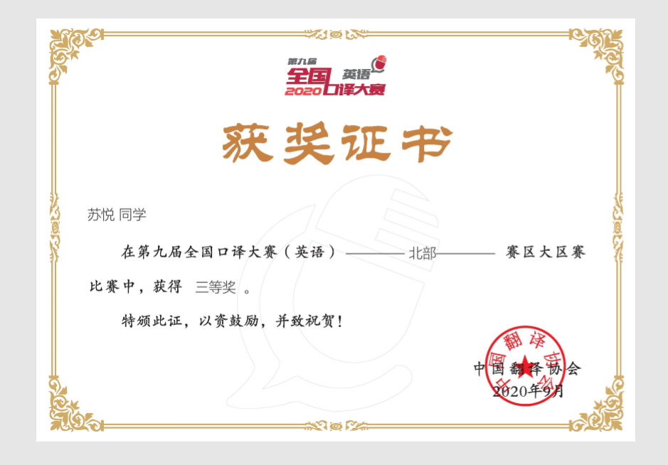 曲阜师大新闻中心讯(通讯员:孙晓兰 厉平执)近日,第九届全国口译大赛(英语)北部赛区大区赛圆满结束,我校翻译学院2019级硕士研究生万芷晴、2017级翻译本科生苏悦分别荣获三等奖,2018级翻译本科生姜睿芯荣获优秀奖及“译员风采奖”。