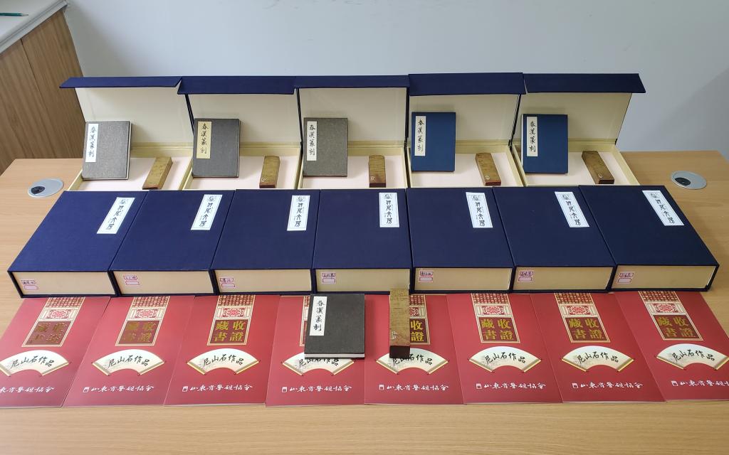 印章石料取材于孔子诞生地尼山,尼山石色泽鲜艳、松花叠翠、纹理明快,被砚界誉为“尼山圣石”。十三方印面是李春汉教授根据每一位毕业生姓名和汉字具体特征而分别创意设计,端庄灵秀、规整遒劲、阔拔雄健,也有玉箸篆的筋道雋永、现代印的写意抒怀,整体印风古朴典雅,充满浓厚的人文气息。印章还配以印折、印座和作品说明,并用礼盒包装。
