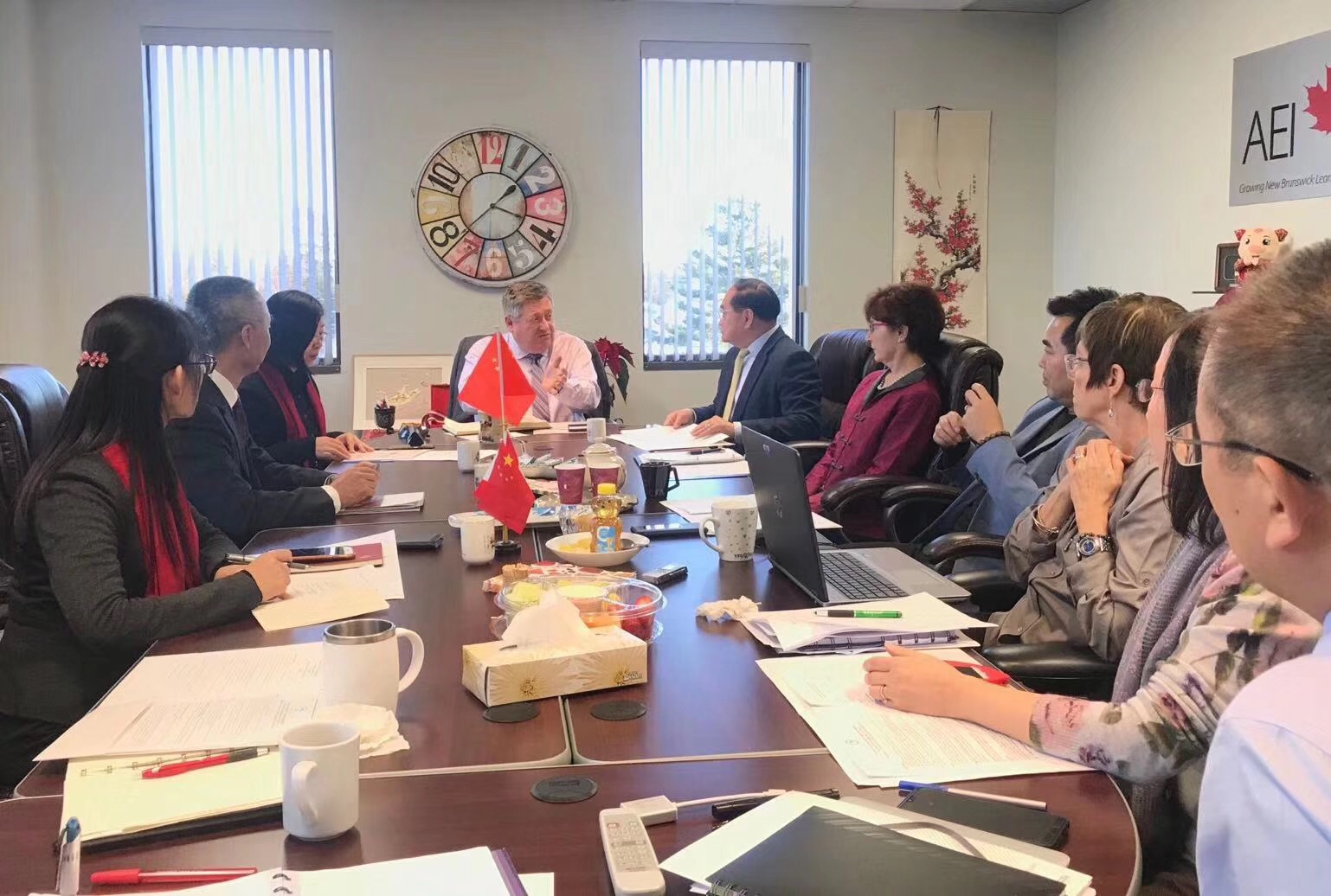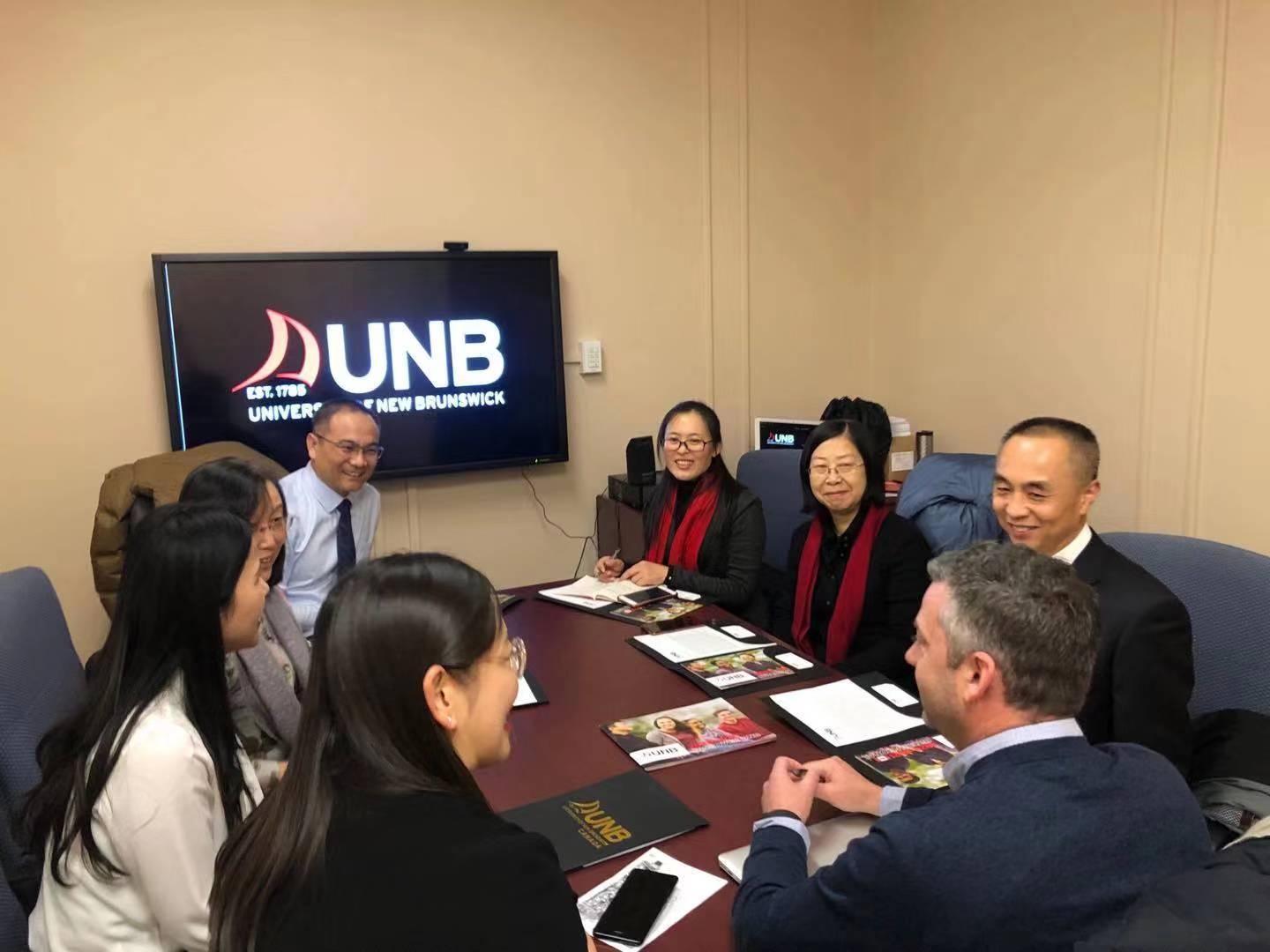在参加理事会期间,代表团还访问了新布伦瑞克大学。分管国际化的副校长鲁瓦德·汉德森(Lloyd Henderson)、国际处处长克里斯·比尔兹沃斯(Chris Beardsworth)以及我校优秀毕业生、曾在新省孔院任教、现为新布伦瑞克大学国际处项目官员的蒋洁热情接待了代表团一行,他们介绍了新布伦瑞克大学及其国际化教育发展情况。宾主双方就两校的学生互派、教师互访以及共同开展科研合作等事宜进行了探讨,并达成共识。