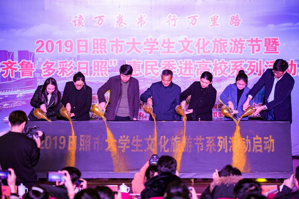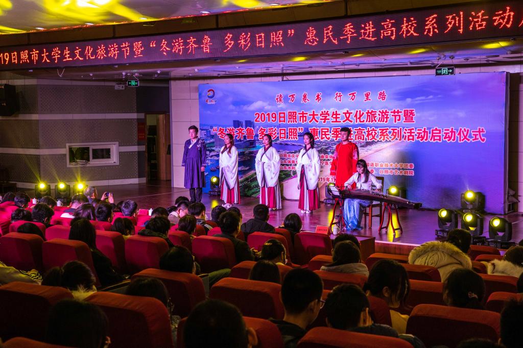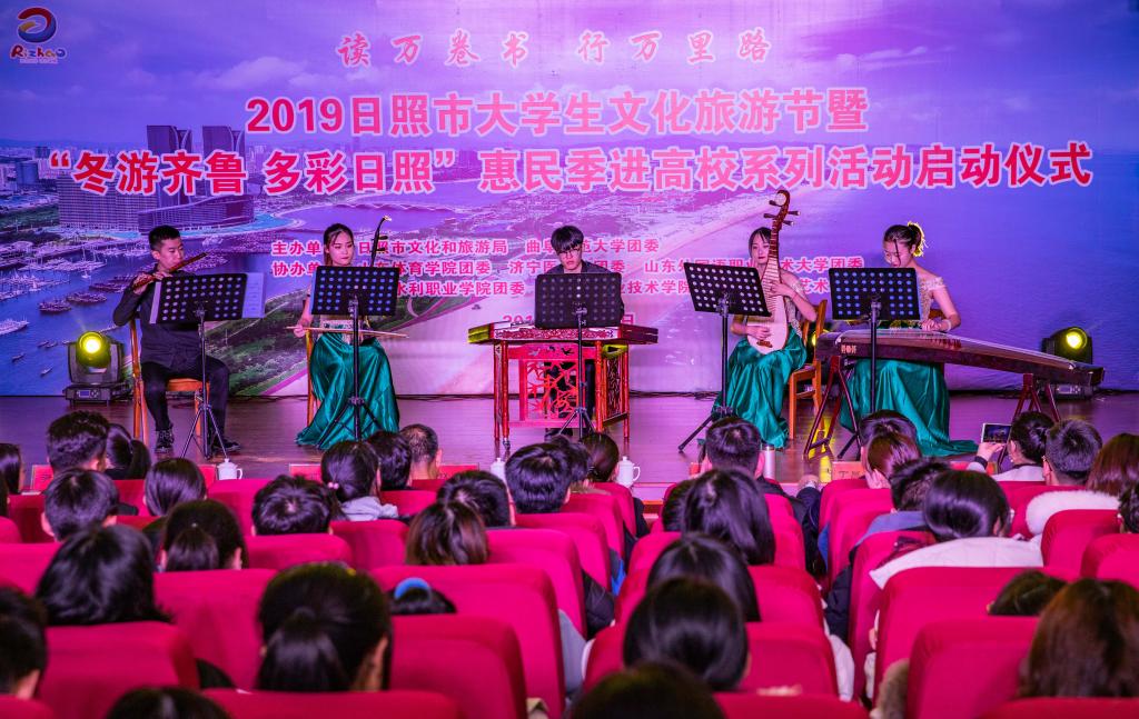 12月4日下午,以“读万卷书 行万里路”为主题的2019日照大学生文化旅游节暨“冬游齐鲁 多彩日照”惠民季走进高校系列活动启动仪式在我校日照校区图书馆报告厅举行。日照市文化和旅游局副局长赵志超、校团委书记宋国栋出席并致辞。驻日各高校团委领导、教师和学生代表、各区县文旅部门分管负责人、各文旅企业代表、媒体记者600多人参加活动。我校音乐学院与日照市艺术剧院联合为现场观众带来了舞蹈《茶韵》、丝弦五重奏《江南风韵》等精彩节目演出。