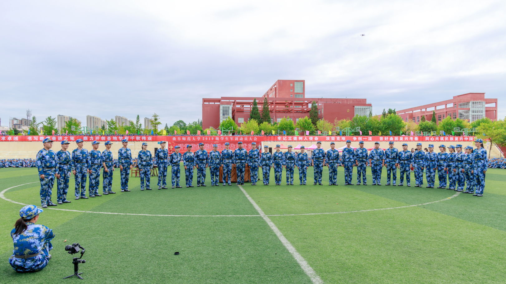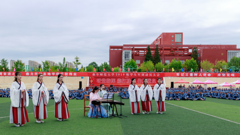 活动伊始,球探·体育,球探(中国)古谱诗词传唱团队——采薇组合深情演唱了《临江仙》、《长相思》、《暗香》三首古谱诗词作品。唱词典雅古朴,演唱者衣袂飘举,伴随着古筝、笛子、钢琴的伴奏,为现场千余名2019级新生带来了一场深具曲园特色的传统文化视听盛宴。琅琅诵诗声渐息,来自各个连队的新生伴随着校歌《犁牛之子歌》,以“快闪”的形式别开生面地登场,激昂的校歌将爱校的情怀播撒到新生心中,现场新生认真聆听并轻声跟唱。