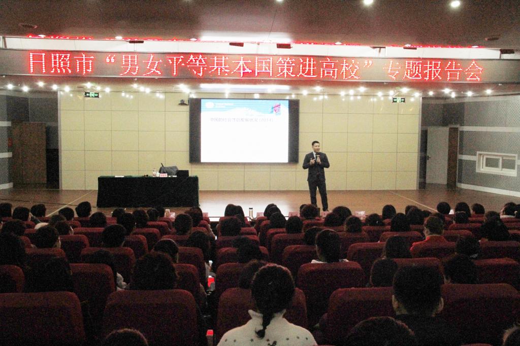 3月1日下午,为进一步加强“男女平等基本国策”宣传教育,在第109个国际妇女节来临之际,我校工会(妇委会)与日照市妇联联合举办的“男女平等基本国策进高校”专题报告会成功举办。联合国妇女署驻华办公室高级项目官员、管理学博士、著名性别专家马雷军教授受邀做专题报告。校区各分工会工会委员、女工委员、女教工代表以及学生代表聆听了报告。