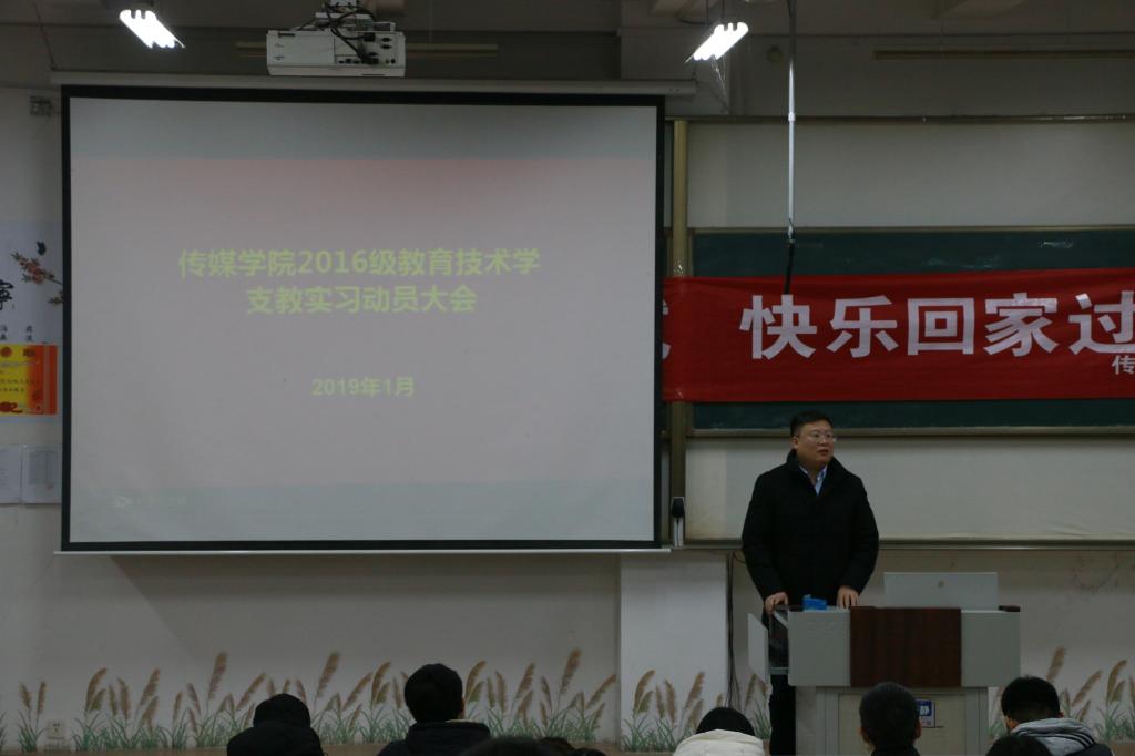 为贯彻落实《球探·体育,球探(中国)师范生实习支教工作管理办法》相关规定,保障实习工作顺利开展,传媒学院于1月17日召开2016级教育技术学专业实习支教动员大会。传媒学院党委书记李兴保、党委副书记徐正伟、副院长赵可云、团委书记张守荣及全体实习指导老师出席,2016级教育技术学专业全体学生参加大会。