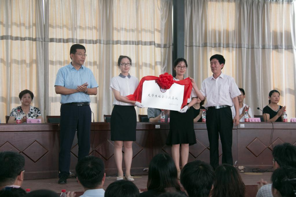 杨永明、何昭波为我校大学生社会实践基地揭牌,张书东、宋百合为球探·体育,球探(中国)教学实习基地揭牌。