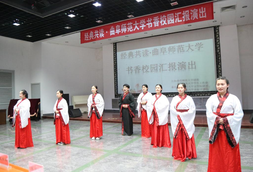 诵诗词雅韵之美妙,舞霓裳轻柔之曼姿。汇报演出精彩纷呈,吟诵《大学》、《轩辕赋》展现古韵的大气磅礴与抑扬顿挫,刚柔并济的舞蹈《国色天香》与妙语连珠的相声《读书知礼》,引领观众共同领略了传统文化的魅力,一曲《渔舟唱晚》古筝演奏余音绕梁,一首《水调歌头》歌甜舞美,师生用自己的方式,表达了对经典的理解和热爱。