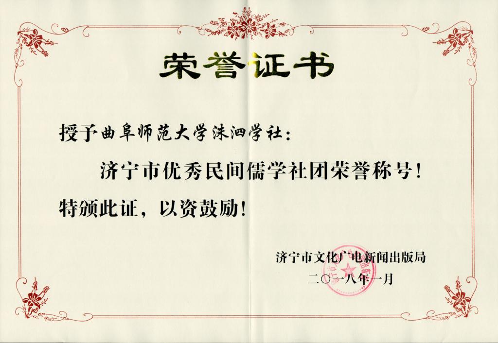 近日,济宁市首批“优秀民间儒学社团”等奖项的评选落下帷幕,由我校历史文化学院和图书馆联合推荐的洙泗学社获评济宁市“优秀民间儒学社团”。
