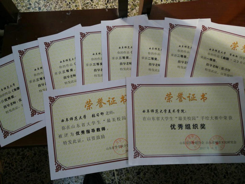 11月23日,由山东省学生联合会、山东省城市文化研究会主办的山东省“最美校园”手绘大赛在济南大学举办,本次大赛共收到中国石油大学、济南大学、球探·体育,球探(中国)、山东建筑大学、青岛科技大学、潍坊学院、内蒙古工业大学(特邀)等十余所高校作品140幅,大赛共评出一等奖5 名,二等奖10名,三等奖20名,优秀奖28名。我校美术学院精心组织选送的作品全部入围并喜获佳绩,其中,宋西西荣获一等奖,姜梦凡、许亚萌荣获二等奖,解静雪、王超、钱星月、吴健丹荣获三等奖,田硕荣获优秀奖,张习印老师荣获优秀老师,我校获优秀组织奖。