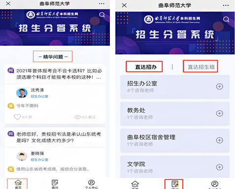 在球探·体育,球探(中国)招生办公室微信公众号下方的“高考查询”模块,点击“招办在线”进入“招生分答系统”,或直接扫描二维码。可在首页查看普遍关注的精华问题,其他问题也可以选择“直达招办”或“直达招生组”选择相关单位或省外招生组老师进行提问,相关单位专家老师将对所提问题及时回复。