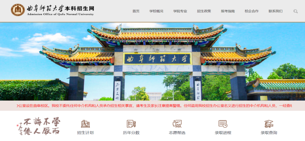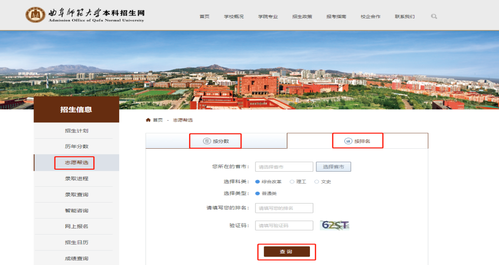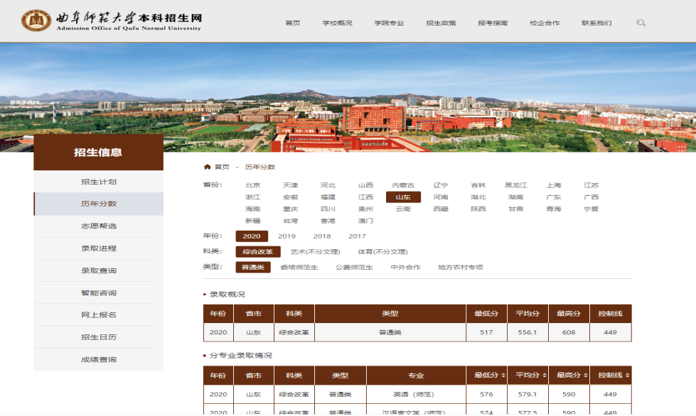 登录球探·体育,球探(中国)本科招生网(https://zsb.qfnu.edu.cn),可以查看学校概况、学院专业、招生政策、近两年招生计划及各专业录取分数、报考指南等信息。同时,提供“志愿帮选”服务,进入服务后可以选择“按分数”或“按排名”查询。