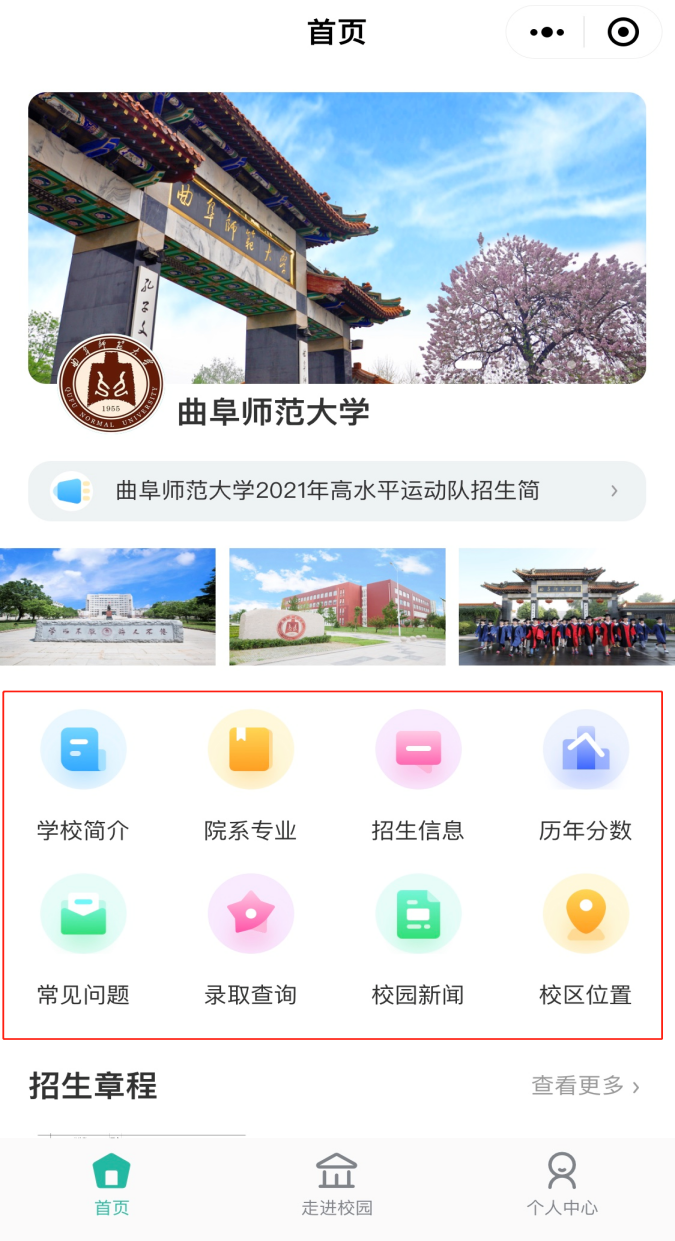 首次使用:手机微信小程序搜索关键字“球探·体育,球探(中国)”或扫描二维码点击进入,可在“首页”查看学校简介、院系专业、招生信息、历年分数、常见问题等信息。