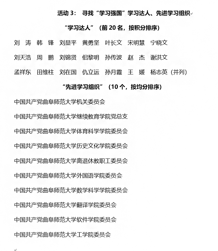 为庆祝中国共产党成立99周年,增进全校党员干部和师生员工深入学习习近平新时代中国特色社会主义思想的积极性和主动性,6月15-24日学校举办“献礼七一 学习再出发”——学习强国知识竞赛系列活动。现将各项竞赛成绩公布如下: