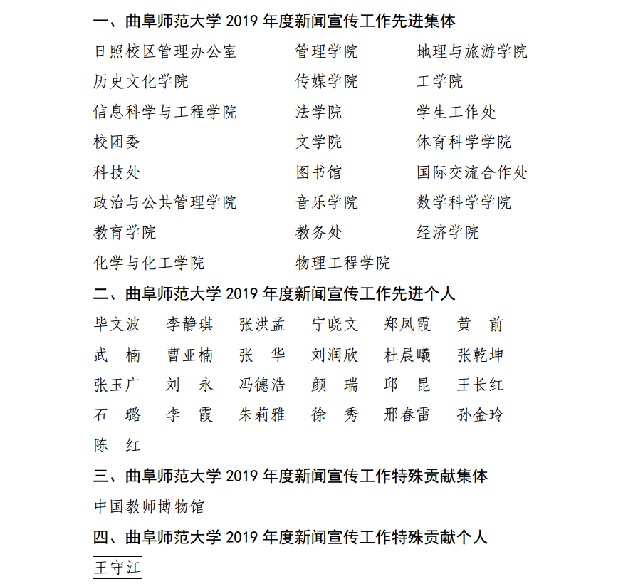 根据活动通知和评选办法,经自主申报、材料核查、汇总评审,党委宣传部现拟评定管理学院等23个二级单位为2019年度新闻宣传工作先进集体,毕文波同志等25人为2019年度新闻宣传工作先进个人,中国教师博物馆为2019年度新闻宣传工作特殊贡献集体,王守江同志为2019年度新闻宣传工作特殊贡献个人。