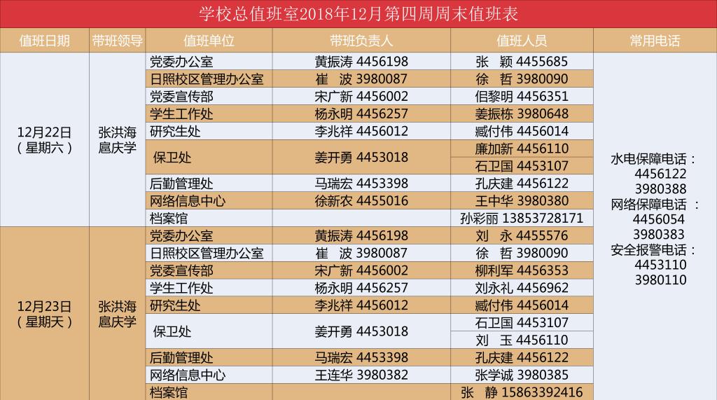 学校总值班室2018年12月第四周周末值班表