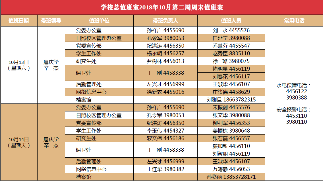 学校总值班室2018年10月第二周周末值班表