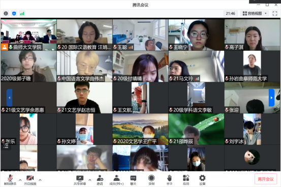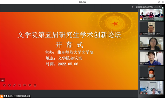 曲阜师大新闻中心讯(通讯员:冯萌萌   摄影:毕琪琪)  为进一步营造学术氛围,开拓研究生科研思路,提升研究生学术交流能力,5月6-7日,曲阜师大文学院利用网络平台举办第五届研究生学术创新论坛。5月6日上午举行开幕式,文学院院长夏静教授、研究生导师代表杨新刚教授出席活动,文学院全体博士、硕士研究生,部分研究生导师等通过网络平台参加。开幕式由霍俊国老师主持。