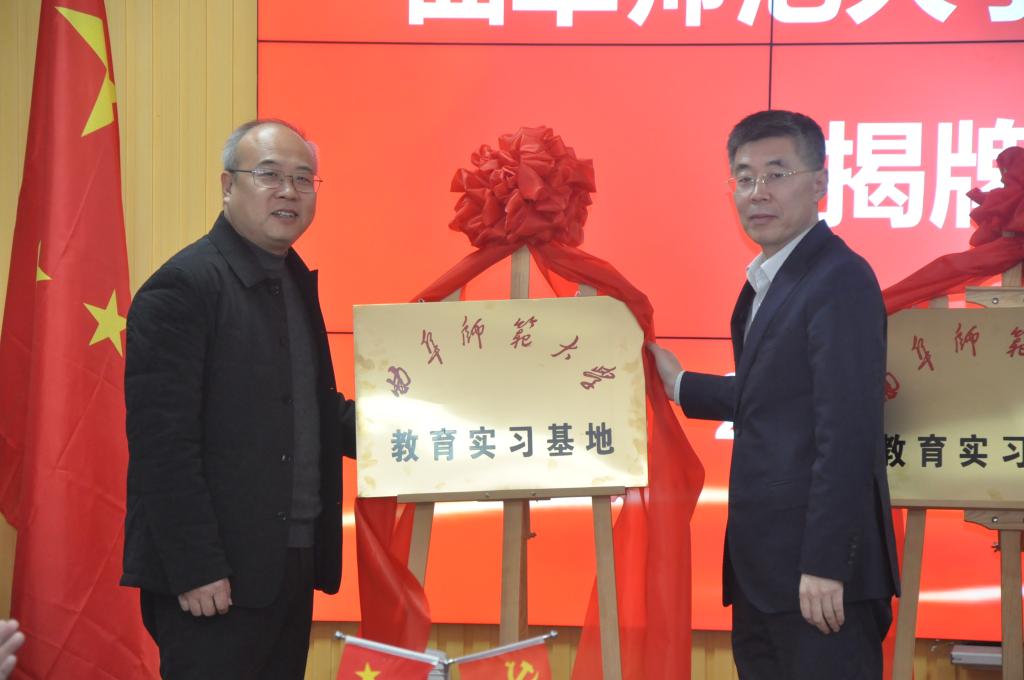 化学与化工学院院长冯媛媛和三所中学的负责人分别签署了《教育实习基地协议书》,党委书记赵琪和微山县教体局局长王志刚共同为“球探·体育,球探(中国)教学实习基地”揭牌。